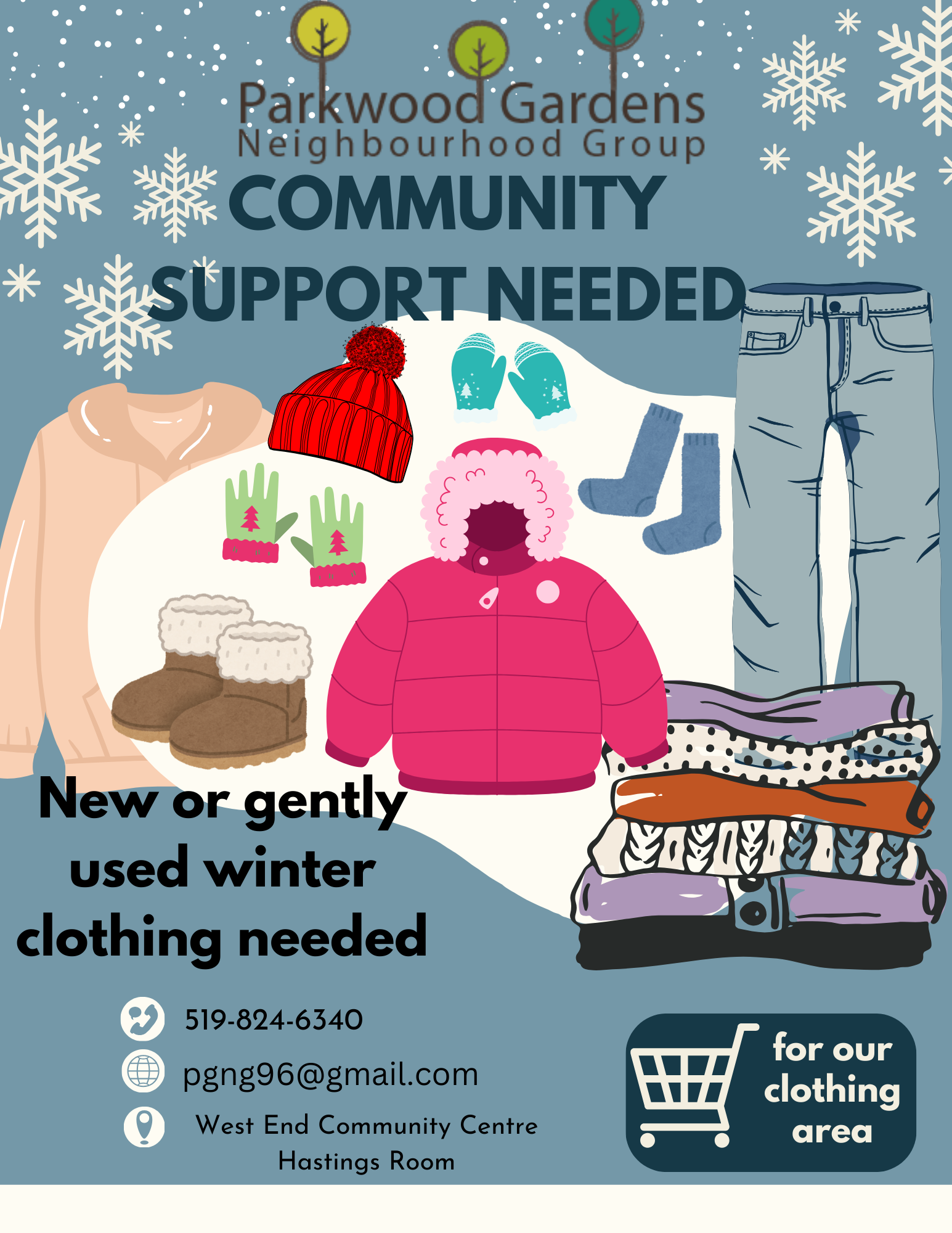 Click here for our poster. Click here to find out how to register.Parkwood Gardens runs a Clothing Closet in our community room (Hastings Room). Drop by and have a look! Donations are always being accepted!